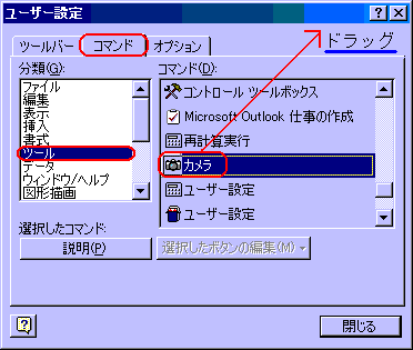 このコマンドを使うには、表示(V)、ツールバー(T)のユーザー設定でカメラをツールバー等へ設置する必要があります。 左図のように、ユーザー設定のコマンドタブの分類からツールを選択し、コマンドでカメラ(カメラのアイコン)を探し、これをツールバーなどへドラッグします。