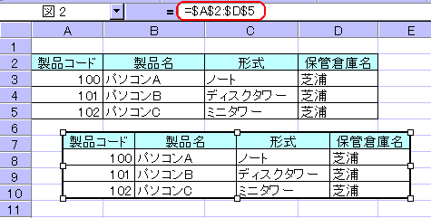 Excelにカメラが付いているの?と思われるでしょうが、実物のカメラではありません。これは、編集No2、Q10で解説した「図のリンク貼付」とほぼ同じ機能です。つまり、ワークシート上の別に所にある表の一部などを図として他の場所へ表示させる機能です。