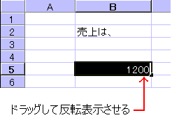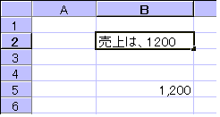 例は、B2セルの「売上は、」の後ろへB5セルの「1200」をコピーする方法です。