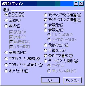 使い方は、選択メニューの中から必要なものを選び、OKボタンをクリックするだけです。これでシートの該当セルが選択(検索)されます。 ただし、メニューによって使い方にコツが必要です。 |