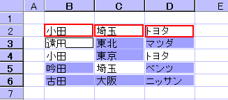 C2、D2と異なるデータをそれぞれの列内から選択(検索)しています。