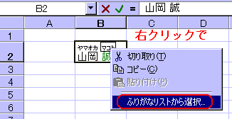 なお、ふりがなにカーソルを入れるには、セルを選択→クリックしてふりがなにカーソルを入れることもできます。