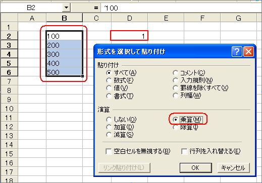 そして、右クリックから、「形式を選択して貼り付け」を選択し、上図のように演算の「乗算」を選択してOKボタンをクリックします。これで選択した範囲の数字はすべて数値になります。最後にD2の1を削除。