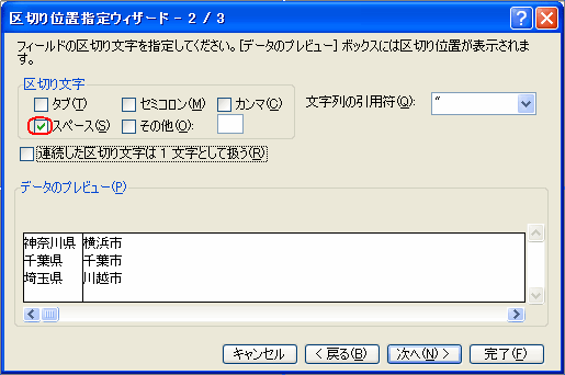 ウィザードが「2/3」となります。そして、区切り文字の中から「スペース」へチェックを入れます。スペースが無くて「県」で区切る場合は、その他へチェックを入れ横の入力枠へ「県」と入力します。