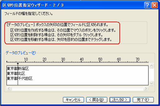 元データが2004/11/12のようなものであれば、その他で「/」を指定文字にしてそれぞれ分けることができます。この場合も「/」は消えます。日付データなどは、詳細な設定をするために、下図のようにウィザード