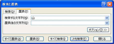 置換から検索と置換のダイアログボックスを表示させ、置換タブを選択します。置換する文字列の入力枠に削除したいデータを入力します。下図では、「山」としています。置換後の文字列の入力枠には何も入れません。そのままで、すべて置換のボタンを押します。