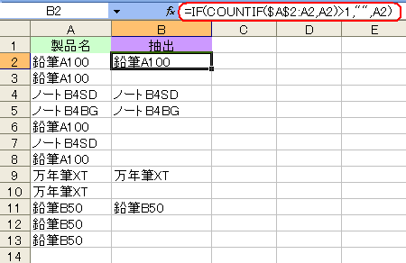 =IF(COUNTIF($A$2:A10,A10)>1,"",A10) となります。常にそのセルより上の範囲内の個数を数えていることになります。この結果、その製品名が上の範囲で1つ以上あれば、空白で返し、1つであればその製品名を返します。これで、最初に出てくる製品名が抽出できるわけです。
