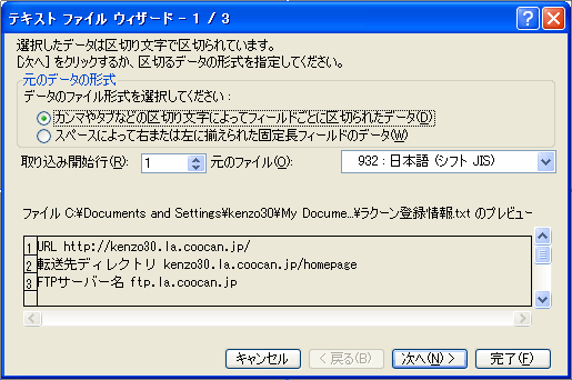 これで、下図のようにテキストファイルウィザードが起動し、データのファイル形式などを選択します。次にボタンをクリックして、あとは案内に従い、操作します。間違ってもやり直しができます。最後まで操作すると、シートにデータが表示されます。カンマやタブで区切られたデータは、きちんとセルに振り分けられているはずです。