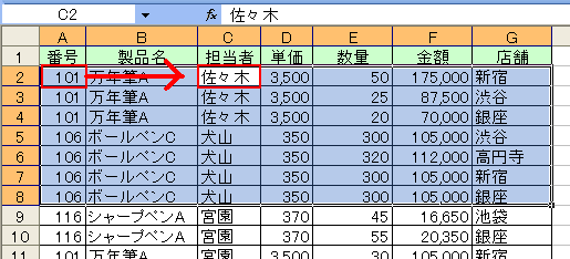 の範囲を選択します。この時、アクティブセルはA2になっているはずですから、Tabキーを押してアクティブセルをC2へ移動します。