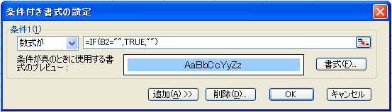 上図のように 条件付き書式のダイアログボックスを呼び出し、「数式が」を選択し=IF(B2="",TRUE,"") と式を入力します。書式でパターンから好みの色を選びます。これでOKボタンをクリックします。