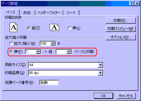 これで横幅が1ページへ収まるように自動的に縮小され印刷できます。なお、逆に縦を用紙内へ収める場合は、「横」を空白にし、「縦」を「1」にします。