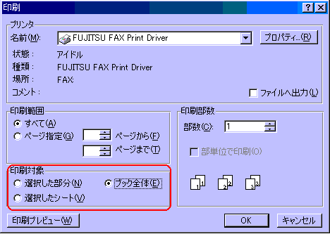 このボックス下部にある印刷対象の中で「ブック全体を(E)」を選択します。 |