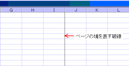 このような時は、ファイル(F)からページ設定(U)をクリックして表示される「ページ設定」ダイアログボックスで用紙サイズや余白等の設定を行うと、ワークシートにページの境を表す破線が表示されます。