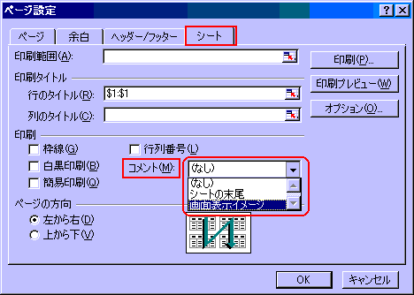 「画面表示イメージ」を選択するとシート上に記入されているその状態で印刷することができます。ただし、この場合はシート上へコメントを表示させておく必要があります。シート上へ表示させたコメントのみ印刷されるので、必要のないものは、非表示にしておきます。