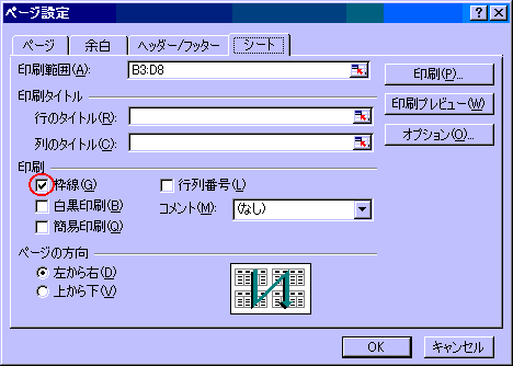 次に、ファイル ⇒ ページ設定からダイアログボックスを表示させます。 左図のように、シートタブ内の印刷の先頭にある枠線へチェックを入れます。 |
