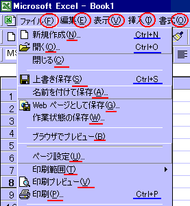 たとえば、ファイルメニューは、ファイルの後ろに記されている下線引きのアルファベット(F)を、「Alt」キーとあわせて押すことで表示させます。「Alt」