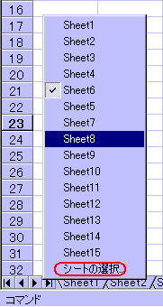 こんな時は、左図のようにシート見出しの左にある見出しのスクロールボタンを右クリックします。するとシート名の一覧が表示され、目的のシートを選択することができるようになります。 |