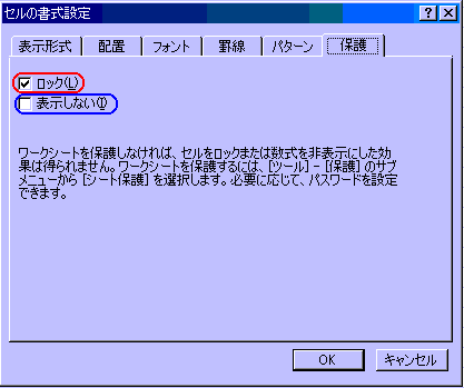そのためには、保護しないセルを選択し、書式からセルの「セルの書式設定」ダイアログボックスを表示させ、この「保護」タブで設定します。