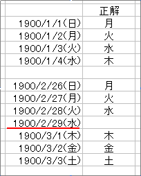 実は、この1900年を基準とした場合、1900/1/1〜1900/2/28までの曜日表示が間違って表示されます。