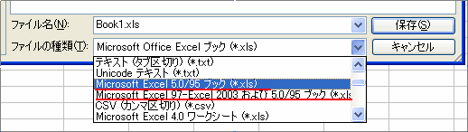 Excel5.0や95の場合は、「Microsoft Excel 5.0/95 ブック」を選択します。また、2003で97や2000の形式で保存するには、「Microsoft Excel 97− Microsoft Excel 2003 および5.0/95ブック」を選択することもできます。