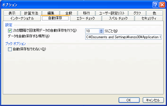 なお、この機能を使うには、自動保存機能を有効にしておく必要があります。ツールからオプションをクリックして、オプションダイアログボックスで自動保存の設定をします。自動保存タブの自動保存のチェックボックスにチェックを入れ、保存間隔時間を設定しておきます(下図参照)。