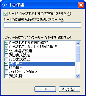 シートの保護によってシート全体が保護され、何も入力できなくなります。また、数式バーに数式などを表示させたくない時は、セルの書式設定の保護タブで「表示しない」にチェックを入れておき、保護を掛けます。ただし、部分的に入力したいセルは、保護のロックを保護を掛ける前に外しておくとともに、「表示しない」のチェックも外しておきます。こうすれば、そのセルは、データ入力やある程度の編集が可能になります。 さて、Excel2000までは、このロックを外したセルでも出来ることは、限られていました。入力は出来るものの、フォントサイズや色の変更、背景色の変更などは出来なかったのです。ところが、2002からは、保護するときの設定で、様々なことが出来るようになっています。ロックを掛けているセルであっても、設定によって書式の変更などが出来るのです。