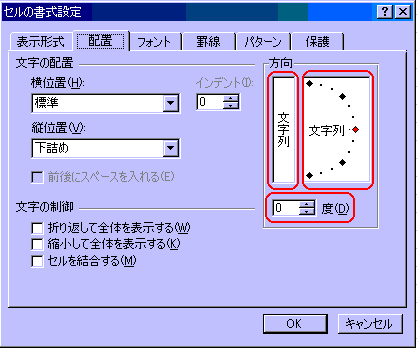 「セルの書式設定」ダイアログボックスを表示させ、「配置」タブを選択し、パネル右側の方向の中にあるボックスでおこないます。(A6の解説図を参照)