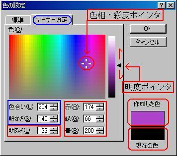 左図が[ユーザー設定]のタブです。 色相・彩度ポインタと明度ポインタを動かし目的の色を作ります。タブの下には、色を数値で表しているボックスがあります。 |
