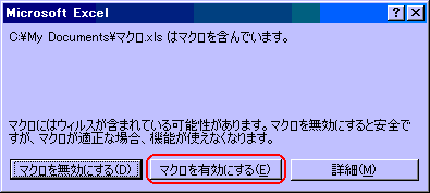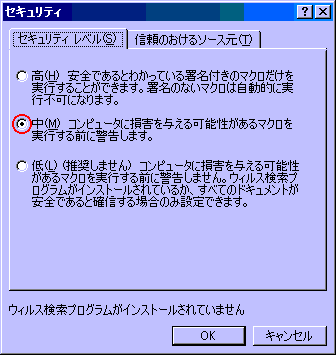 レベルが高では、通常マクロが含まれていると無効化されます。 中の場合は、マクロが含まれていることを警告するボックスが表示され、有効にして開くか無効して開くかの選択ができます。 低では、すべてを有効にして開きます。