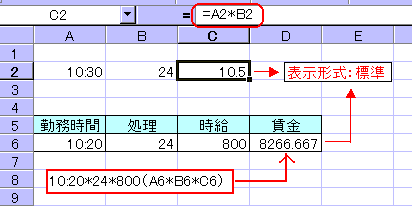 左図のように、10:20*24*800として表示形式を標準にすれば正しい賃金、8266.66…円が求まるはずです。 |