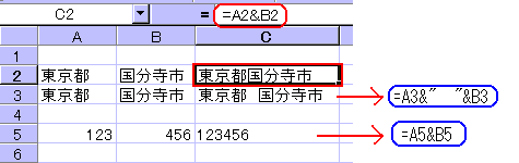左図のように、A2へ東京都、B2へ国分寺市と入力されているような場合、これをC2へ結合させるには |