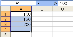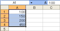 A4に合計値を出すために、A1からA4まで選択しておいて(上図の左)、Alt + Shift + = (等号)と打ちます。これでA4セルは=SUM(A1:A3)になり合計値450が表示(上図の右)されます。上図の数式バーには、A1セルの100が表示されていますが、A4セルを選択すると=SUM(A1:A3)を確認することができます。