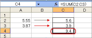 これを避けるには、あらかじめ四捨五入した数字(5.6と3.9)を入力するか、ROUND関数で四捨五入したものをSUMで合計します。関数で桁調整したものは、計算に使うことができます。