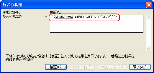 数式の検証 をクリックします。すると、下図のような数式の検証ダイアログボックスが表示され、関数式が表示されます。