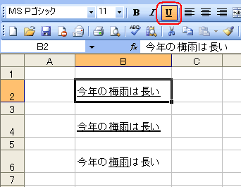 下線はセル単位ではなく、フォント単位で引くことができます。たとえば、上図の例のように「今年の梅雨は長い」という文章の、「梅雨」のみに下線を引くことができます。セル内にカーソルを入れ、下線を引きたいフォント部分をドラッグして反転表示させておいて、上記の操作を行います。