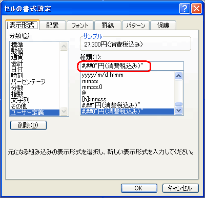 種類の入力枠に #,##0"円(消費税込み)"と入力しOKボタンをクリックすれば完成です。 文字列の 円(消費税込み) を""で囲むことをお忘れなく。 |