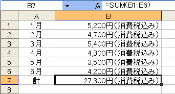 27,300円(消費税込み)をセルにそのまま打ち込んだものは文字列になります。文字列は、計算対象になりませんのでSUM