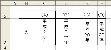 (C)20年の20を横のままその表記したもの。これは、横書きのまま、一文字ずつAlt+Enterキーでセル内の改行をしたものです。例では、横位置、縦位置とも:中央揃え。文字の制御で、「折り返して全体を表示する」にチェック。