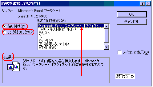 貼り付け形式(A)でワークシートオブジェクトを選ぶと、リンク貼り付けができます。