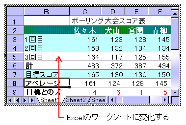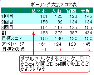 ワード側の表をダブルクリックすると、エクセルが自動的に起動して、リンクしているワークシートが表示されます。エクセル側でデータの修正をする事ができるようになります。