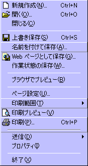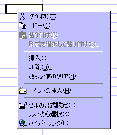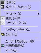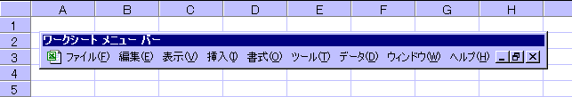 ■メニューバーエクセル(Excel)のメニューバーは、ファイル(F)、編集(E)、表示(V)、挿入(I)、書式(O)、ツール(T)、データ(D)、ウィンドウ(W)となっています。 ◆メニューバーの例 Excel2000