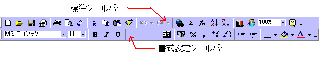 ■ツールバー◆標準、書式設定ツールバーツールバーとは、メニューバー内にある使用頻度の高いコマンドをボタン表示したものです。このコマンドを実行するボタンをツールボタンと言います。(マウスポインタを合わせると、その機能が表示されます)クリックで実行されます。