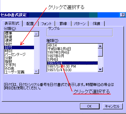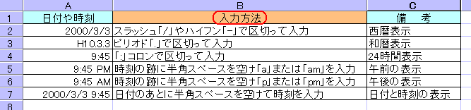 これ等の例は、日付と時刻入力の基本パターンです。すべてではありませんが、日付と時刻の入力にはこのように一定のルールがあります。我流で設定した日付や時刻では、日付や時刻として認識されませんので注意してください。 これらの方法で入力すると、セルには自動的に日付や時刻の表示形式が適用されます。表示形式とは、データを定められた形式で表すもので、書式設定の一つです。 表示形式は、その他に百分率(%)や数値の桁表示、通貨表示などがあります。表示形式は、セルの書式設定で、自由に設定したり変更したりすることができます。 ※書式はデータをDeleteでクリアしても、そのセルに設定されたままです。