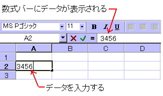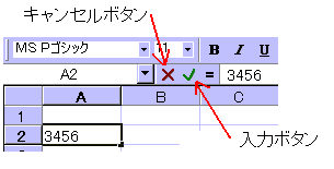 あまり使うことは少ないかもしれませんが、クリックするとそれぞれ、キャンセルと入力の確定ができます。 ※最新バージョンのエクセル(Excel)2002からは、この両ボタンはなくなりました。 |