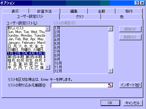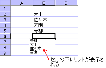 なお、この機能も数値、日付、時刻のデータは、リストには表示されません。 ※オートコンプリート機能は、メニューバーの「ツール(T)」「オプション(O)」のダイアログボックスを表示させ、編集パネルにある<オートコンプリートを使用する(C)>のチェックマークをはずせば機能しなくなります。標準では、ONになっています。なお、リストからの選択は、チェックマークをはずしても使うことが出来ます。 |