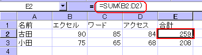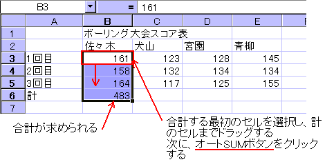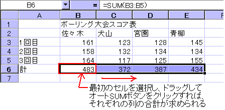 オートSUM ボタンを使った合計値の求め方は、関数貼り付けボタンから使うSUM 関数とは操作方法が異なります。 ※Excel2002では、オートSUM ボタンの機能が強化され、平均や個数などを求める関数も使えるようになっています。
