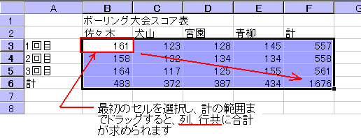 図は、列の合計ですが、行の合計も全く同じ操作で求めることができます。