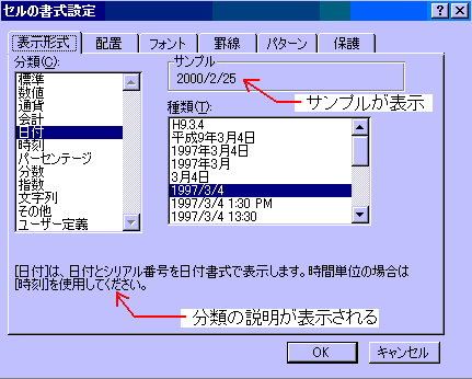 セルの書式設定は、書式設定ツールバーで大体のことは出来ますが、「セルの書式設定」ダイアログボックスからは、表示形式、配置、フォントなどの詳細な設定をまとめて行うことが出来ます。