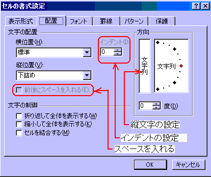 方向では、「縦文字」、「文字に角度をつける」設定ができます。縦文字は、上図で示している部分をクリックし、反転表示させれば設定できます。角度は、度数設定又は表示窓をクリックして行う事ができます。