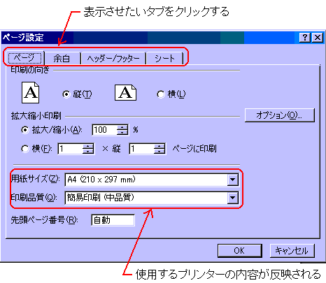 印刷ページの詳細な設定は、「ページ設定」ダイアログボックスで行います。